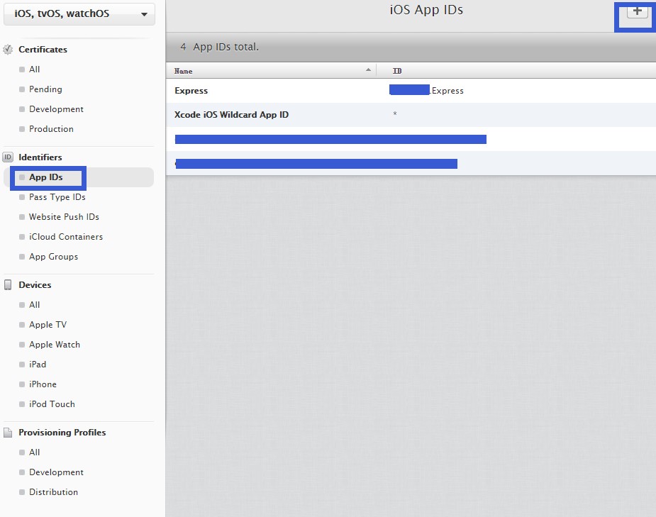 點擊左邊目錄中的“Identifiers”下的“App IDs”,這里是為我們的工程創建一個標示,也就是俗稱簽名,只有滿足標示的工程才能進行真機調試與發布。