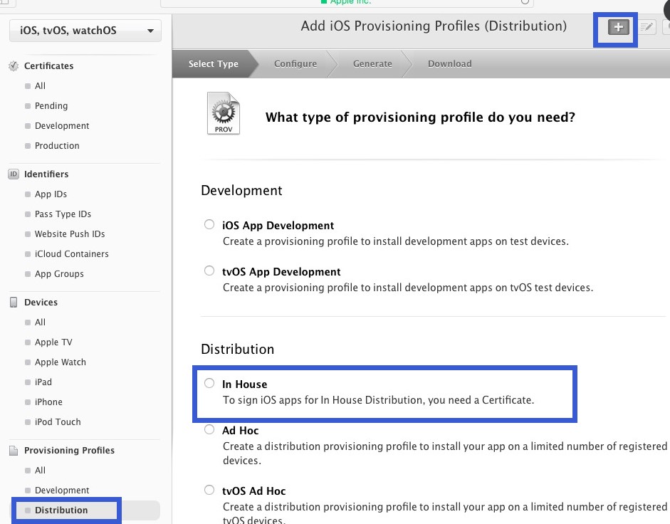 進入Provisioning Profiles——Distribution選擇 In House ——Continue