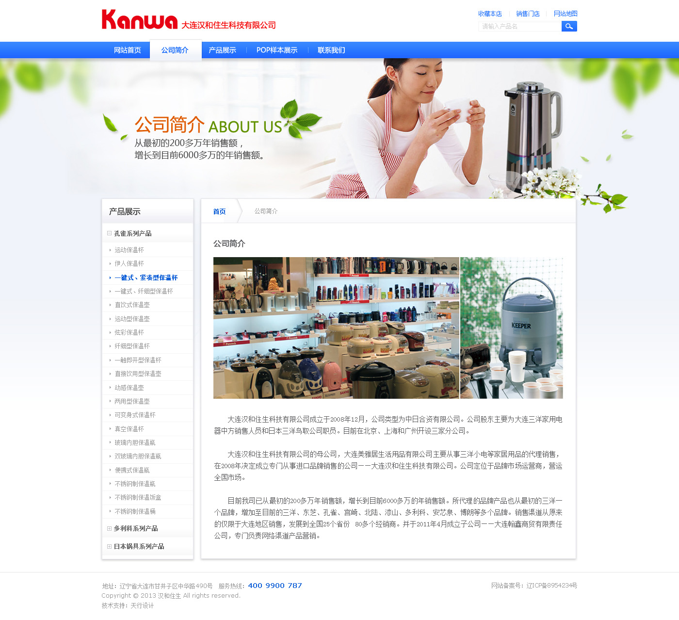 大連漢和住生科技有限公司成立于2008年12月,公司類型為中日合資有限公司。公司股東主要為大連三洋家用電器中方銷售人員和日本三洋鳥取公司職員。目前在北京、上海和廣州開設三家分公司。 大連漢和住生科技有限公司的母公司,大連美雅居生活用品主要從事三洋小電等家居用品的代理銷售,在2008年決定成立專門從事進口品牌銷售的公司——大連漢和住生科技有限公司。公司定位于品牌市場運營商,營運全國市場。 目前我司已從最初的200多萬年銷售額,增長到目前2500多萬的年銷售額。所代理的品牌產品也從最初的三洋一個品牌,增加至目前的三洋、東芝、孔雀、宮崎、 鶴家等多個品牌。銷售渠道從原來的僅限于大連地區銷售,發展到全國21個省份60多個經銷商 ...